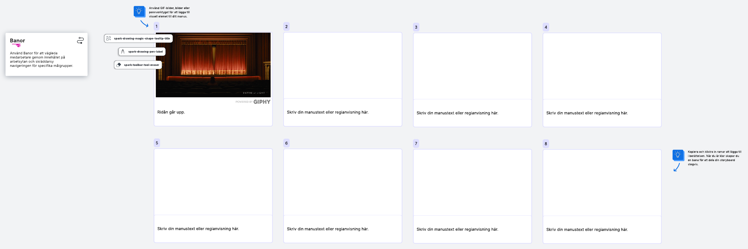 Med den här storyboardmallen kan du enkelt presentera en överblick av ditt projekt. Använd den för att kartlägga scener i en berättelse, presentation, video eller något annat kreativt projekt.